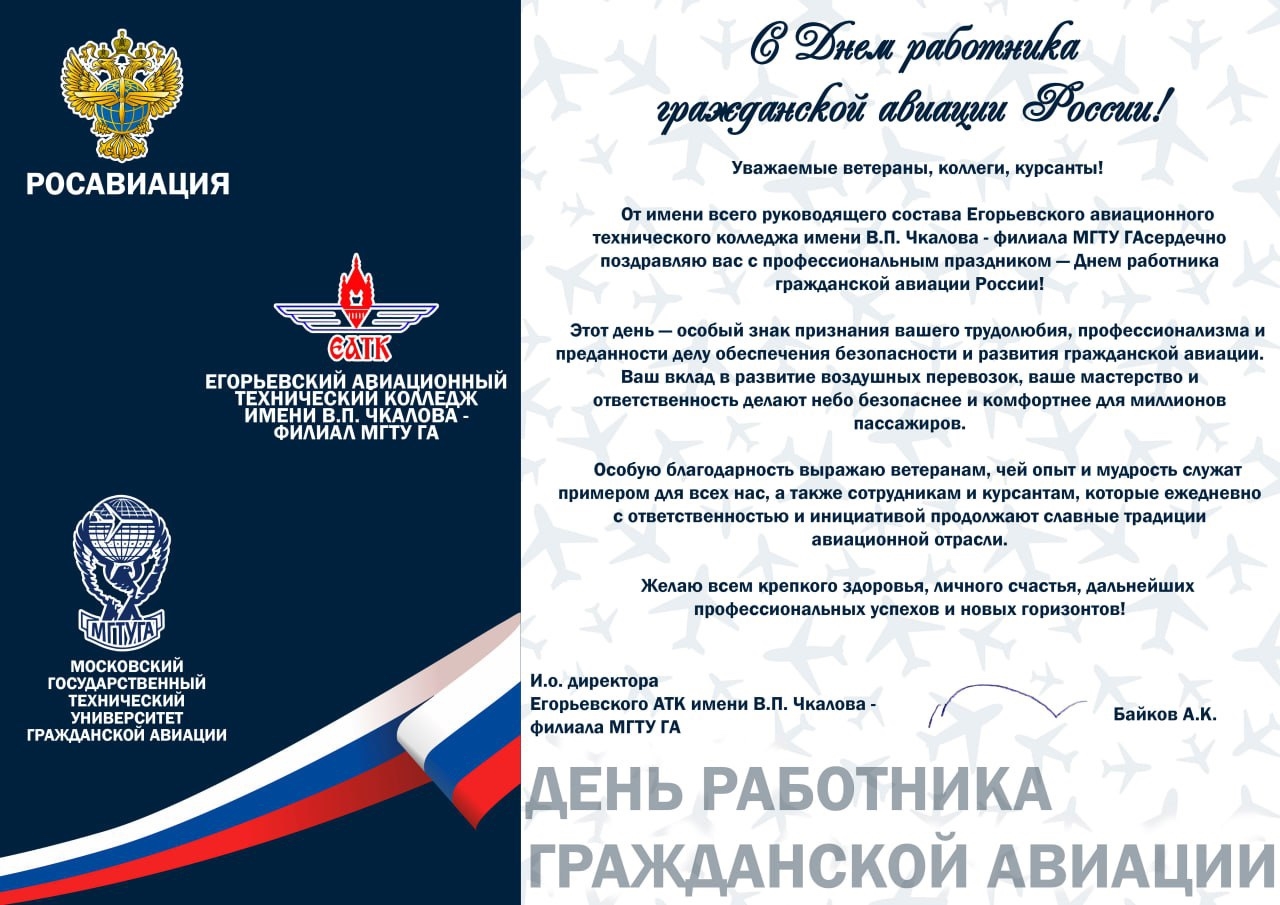 И.о. директора Егорьевского авиационного технического колледжа имени Валерия Павловича Чкалова — филиал Московского государственного технического университета гражданской авиации БАЙКОВ АЛЕКСАНДР КОНСТАНТИНОВИЧ;